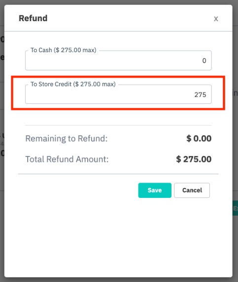 During a return, select Refund and enter the value to add to store credit. Confirm to continue. This will add the value to the customer's store credit.