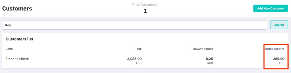 View how much store credit your customer's have accumulated from the Menu → Customers page.