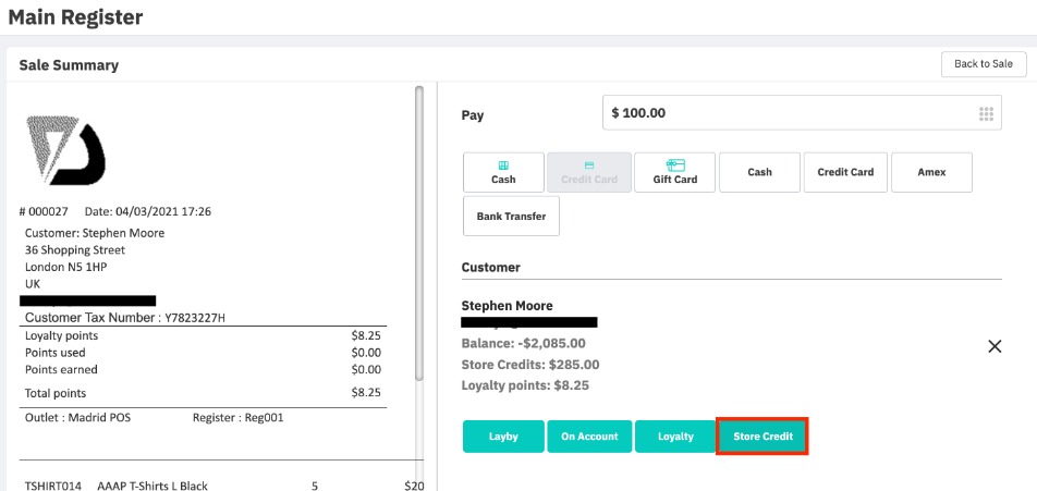 Store credit will only apply to POS stores from the same organization, and cannot be used against sale invoices processed through the Cin7 Core web portal. POS store credit is not counted towards Cin7 Core customer credit.