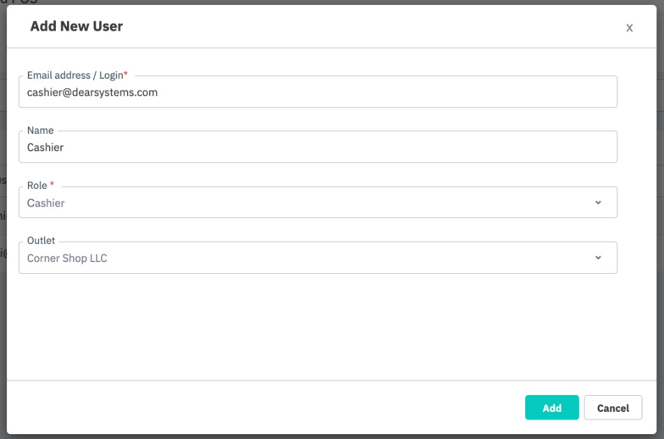 Click Add New User at the top of the Users screen to open a popup window. Enter the new user's Email address (this will be used as the login), Name, Role and allowed Outlet. The new user will receive an activation email with instructions for accessing the POS store for the first time.