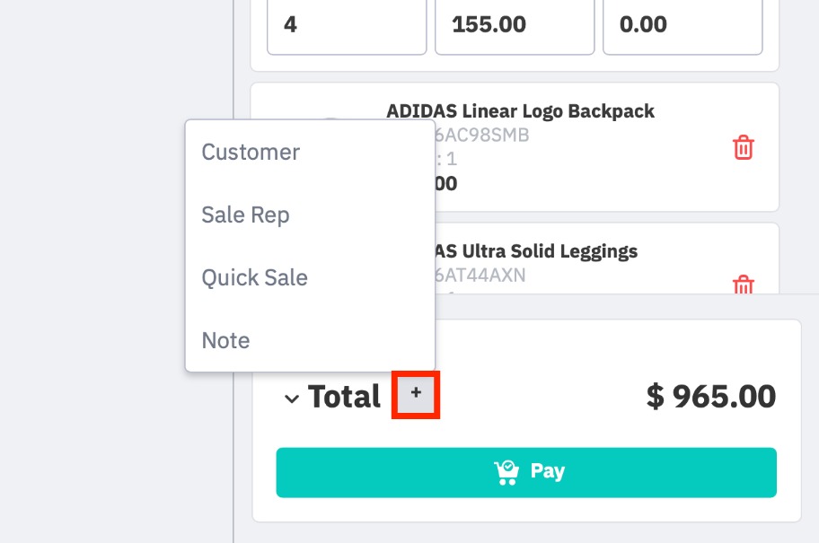 On the bottom right, you can add a customer, sales rep, note, or quick sale (add a product not listed in POS catalog) to the sale.