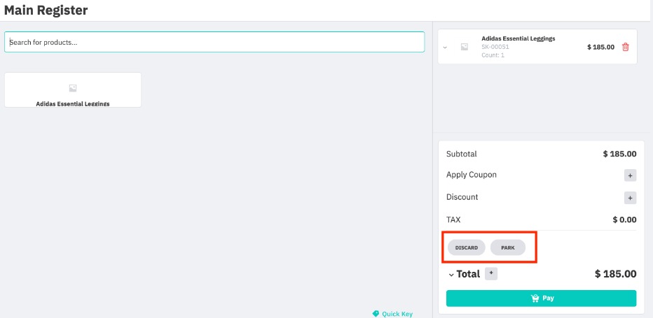 If you are not able to complete a sale straight away, it can be "parked" and returned to later. This will save all the sale details, products, applied discounts, optional information, etc. for later and allow the user to start a new sale from the register.