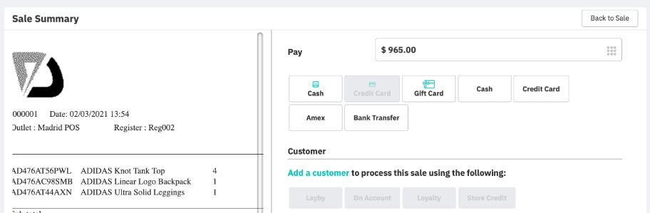 NOTE: Adding a customer is mandatory for some sales features, such as layby sales, on account sales, using store credit or using loyalty points. If you add a customer, you can also add a shipping address for the customer here.