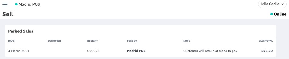 To return to a parked sale, navigate to Menu → Sell → Parked Sales. This will show all sales which have been parked from this outlet. Click a sale to open it, then complete the sale as usual.