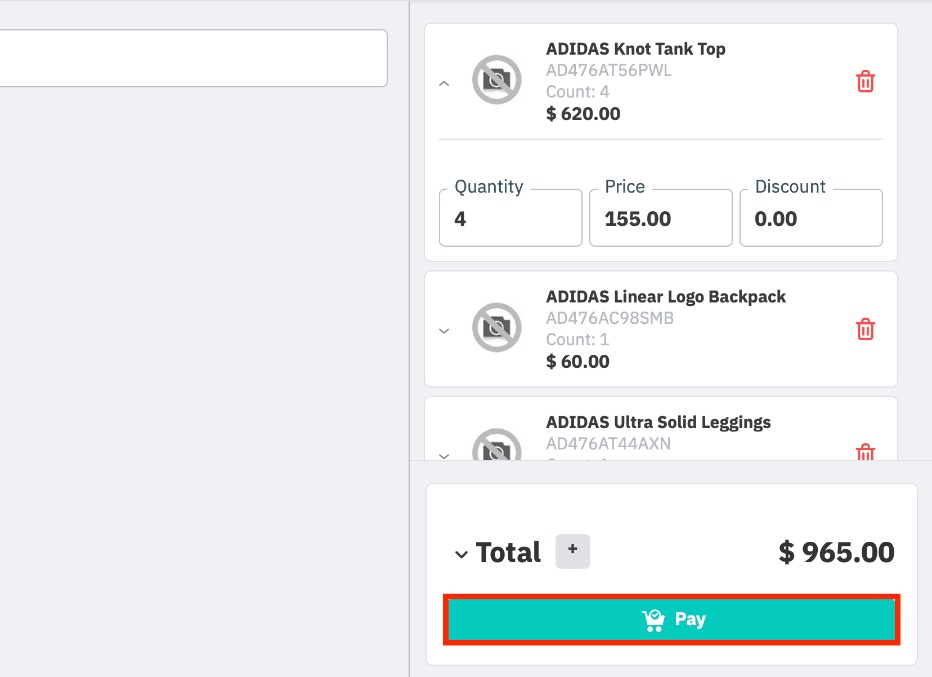 Clicking Pay will take you to the payment screen where you can take payment for the sale.
