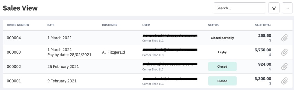 Navigate to Menu → Sell → Sales History to see a list of sales from the Cin7 Core POS store. Sales can be filtered by date, outlet, status and also searched using the search box. Use the attach symbol to attach images or documents to a sale, attachments will be synced to Cin7 Core when sales are downloaded.