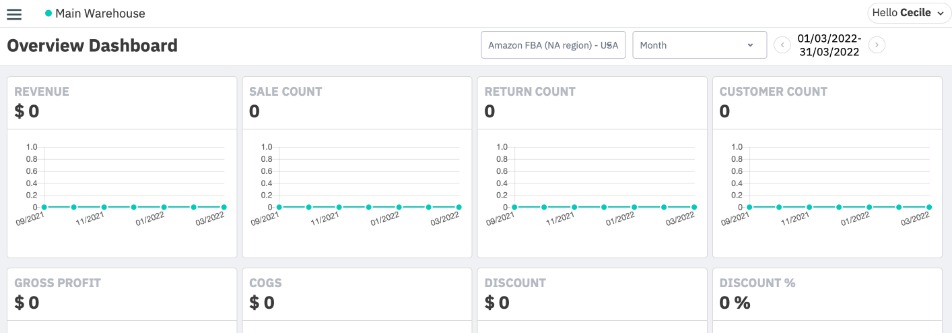 The Dashboard can be filtered by POS outlet and by date range. Users can view Revenue, Sale Count, Return Count, Customer count, Gross Profit, COGs, Discount, Discount %, Basket Value and Basket Size.