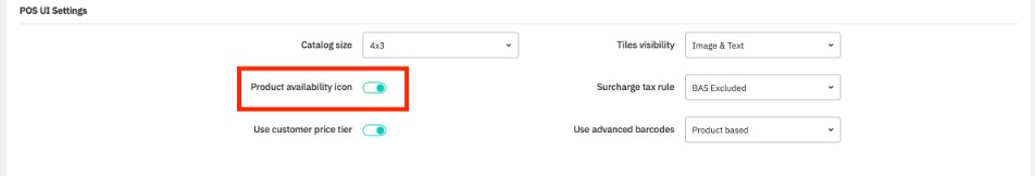 Enabling the product availability icon setting displays a small icon on each product tile in your catalog. Enable this setting from the Cin7 Core web portal, navigate to Integrations → Cin7 Core POS → [select store] → Setup. Under POS UI Settings, ensure the Product availability icon is active.