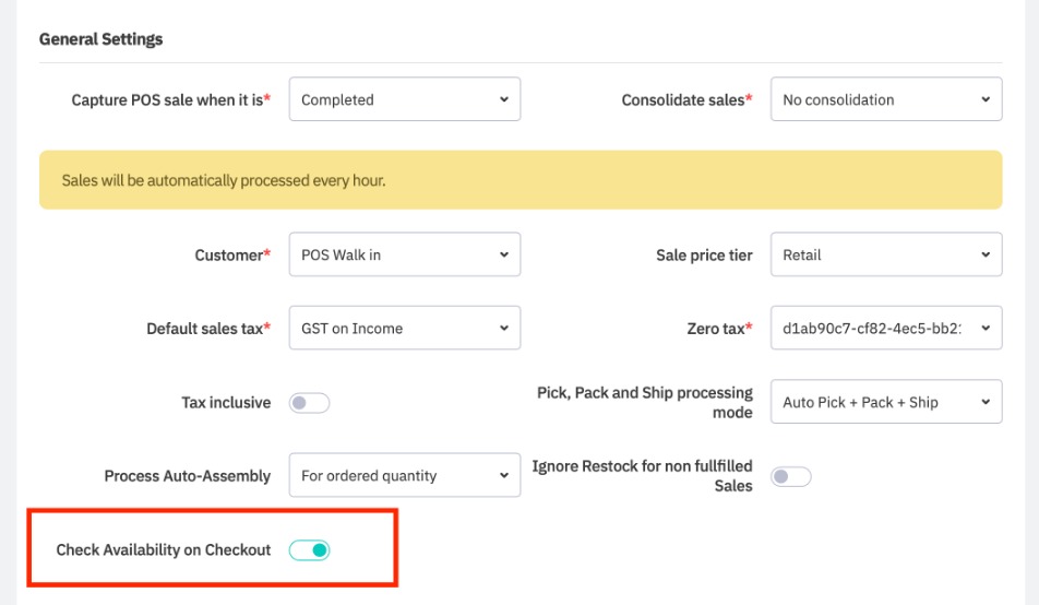 Additionally, from the Cin7 Core web portal, you can navigate to Integrations → Cin7 Core POS → [select store] → Setup → General settings and enable Check Availability on Checkout. This will check the availability of all products in a sale before payment.