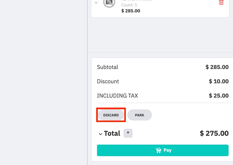 You may select Discard to remove a sale from the register or Park to save a sale for later. Return to parked sales by navigating to Menu → Sell → Parked Sales.