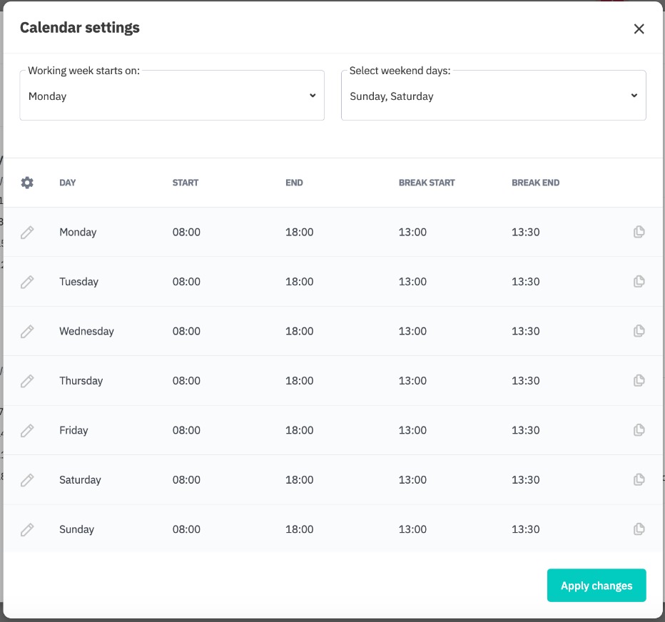Set the start time, end time, and break for each day of the week by clicking on the field for that day. The calendar only allows for one break per day. You can click the copy icon at the end of a row to apply the hours from that row to all weekdays.