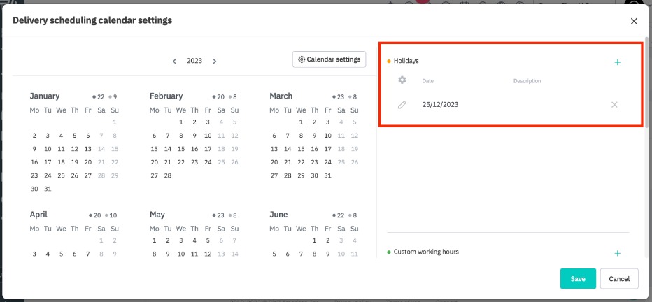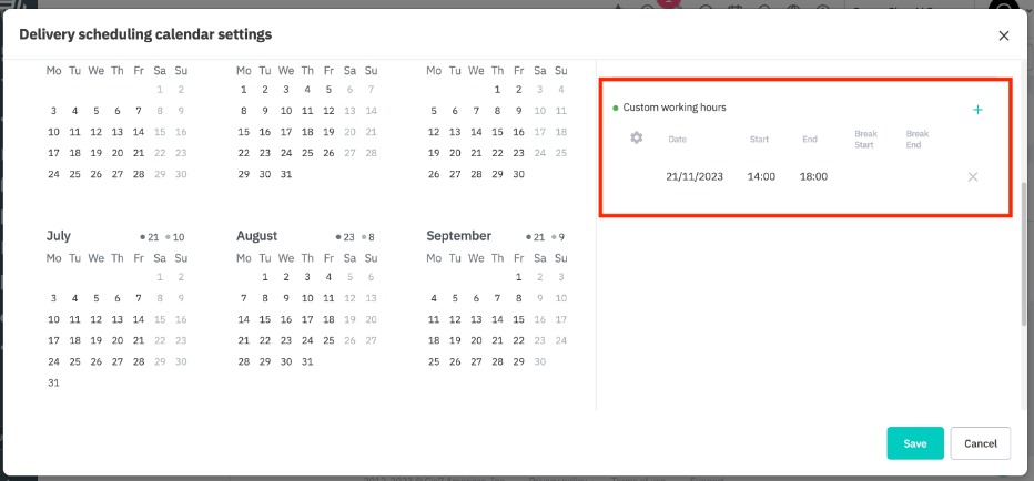 Click the + button next to Custom working hours to add a date and set its custom operational hours.