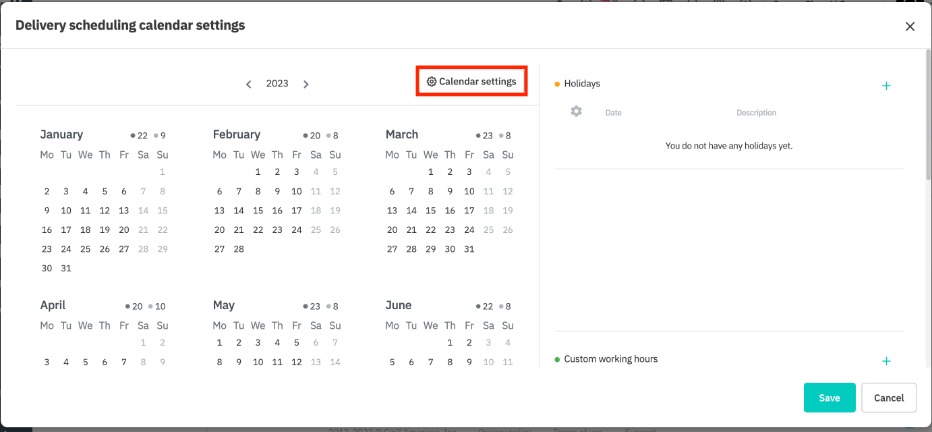 Click Delivery scheduling to open a pop-up window, then click Calendar settings.