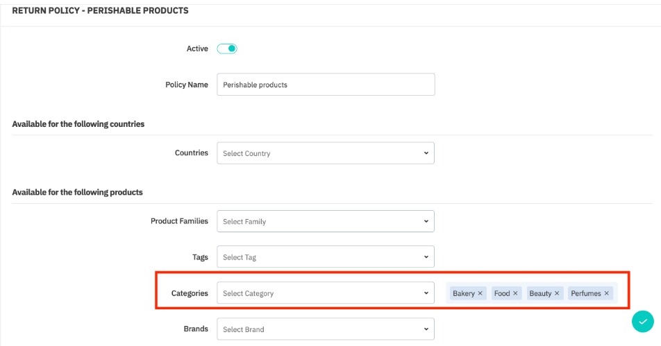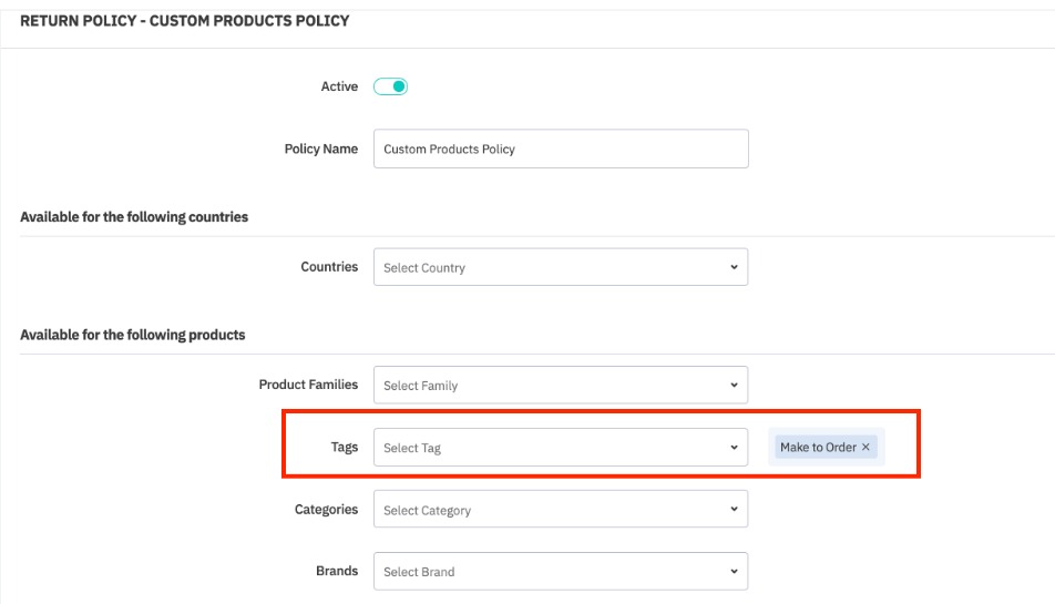 Then, select which products the return policy will apply to. Product families, Tags, Categories and Brands can be selected from the dropdown menu fields.