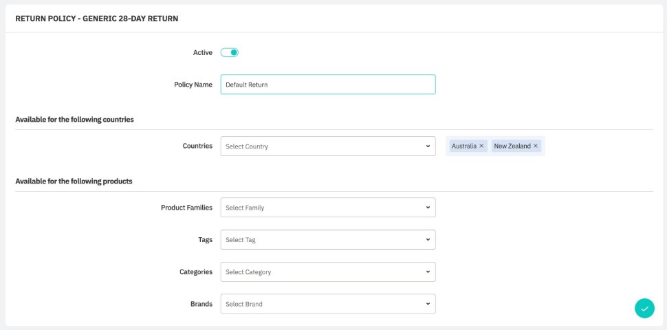 When a product could match several policies, the return policy will be applied in this order or priority: Family, Tag, Category, Brand. Policies that apply to specific product groups will be prioritised over policies that apply to all products.