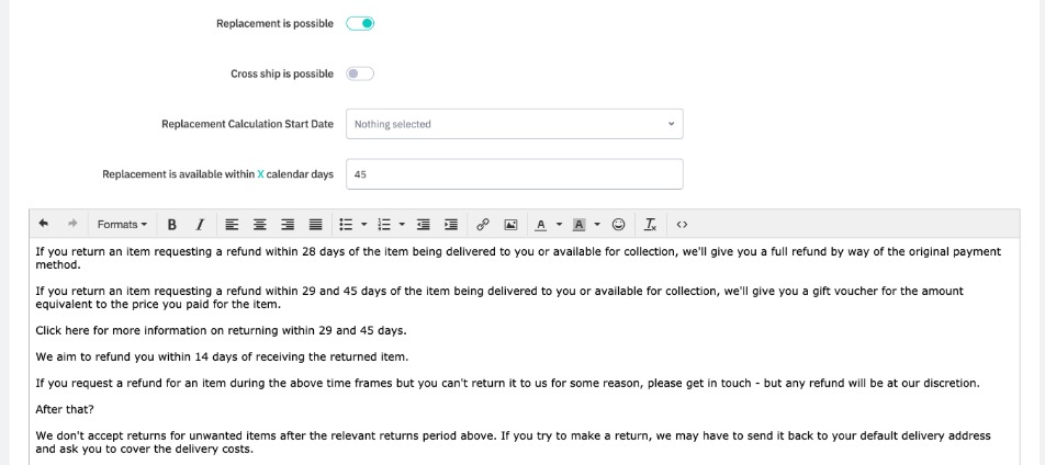 Replacement is possible: When this is enabled, it is possible to offer the customer a replacement during the return.