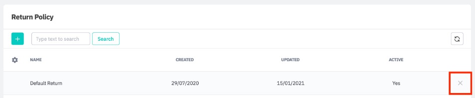 Deleting a return policy removes the policy completely. To delete a return policy, go to Settings → Reference books → Product Return Policy Set Up and click the X icon.