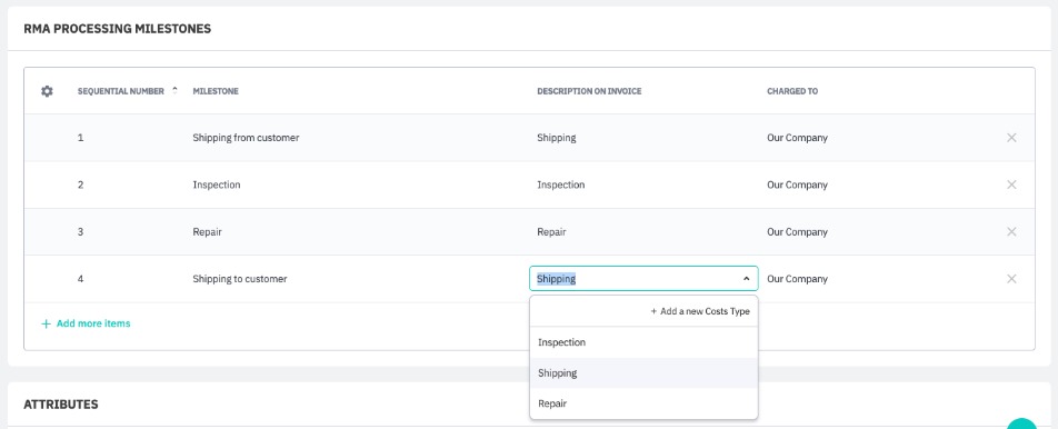 By default, the milestones Shipping from customer, Inspection, Repair, and Shipping to customer are included. These can be edited or deleted according to your business requirements. New milestones can be added with + Add more items. At least one milestone is mandatory.