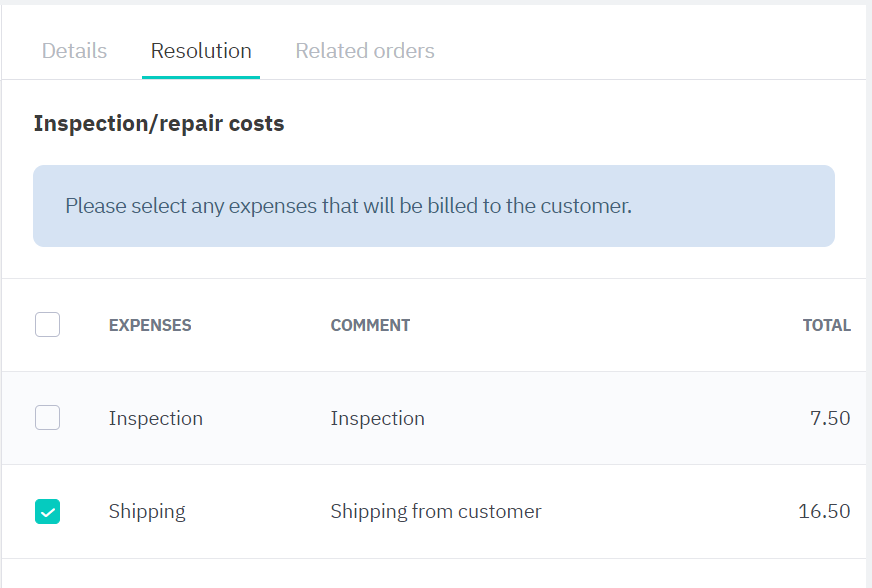 Customers can be refunded for the entire value of the returned product or for the value minus any applicable return expenses. From the Resolution tab, check any expenses you wish to charge to the customer.