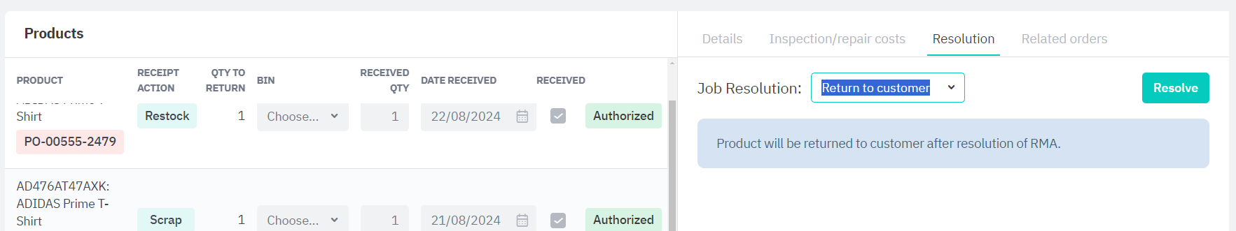 Back on the RMA display, select the Resolution tab for a product. In the RMA resolution drop down field, select to allow or deny the refund or replacement. Clicking Resolve will create a fulfillment task to return the item to the customer, which will appear in the Related orders tab.
