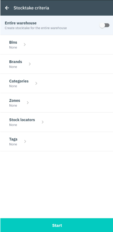 Select to stocktake the entire warehouse, or whether to filter by bins (if available at the selected location), brands, categories, zones, stock locators, or product tags.