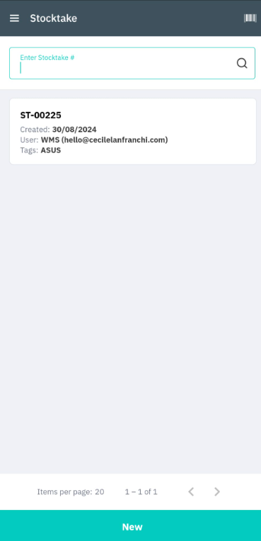 Go to Main menu → Stocktake to see a list of active stocktakes. Active stocktakes can also be searched by stocktake #. Open an existing stocktake or click New to start a new stocktake.