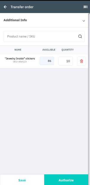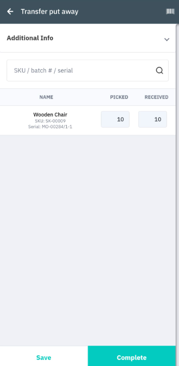 Complete any transfer with Ordered status directly from the WMS app. This includes stock transfers created in Cin7 Core, Cin7 Core POS, Cin7 Core MES and stock transfers between locations that are not the current working area.