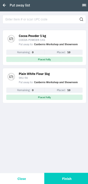 Next, place the required quantity. Scan the SKU or batch/SN number or enter it manually. You may need to press Enter on your device keypad if entering the number manually. Enter the placed quantity or scan all instances to add them to the placed list. It is not possible to partially put away an order.