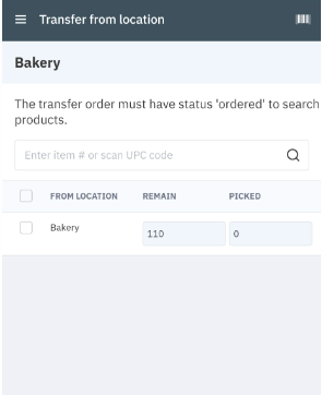 The pick list will show all products to be picked from all bins to send to the selected location. Click a product to open the item detail view.