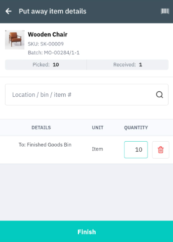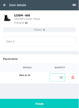 On the item screen, choose the quantity of items to transfer. You can scan each item, manually enter the Item # or adjust the quantity by tapping . Tap Finish to add the item to the bin transfer list.