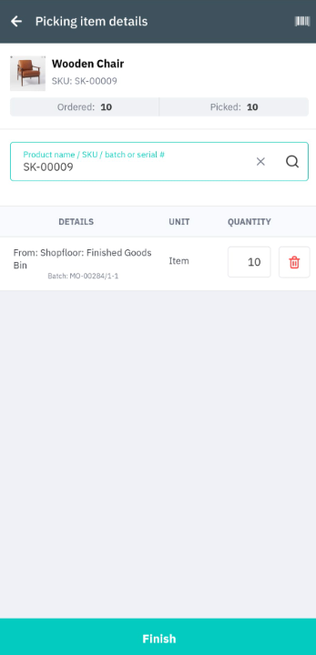 Enter the picked quantity or scan all instances to add them to the picked list. Partial picking is allowed.