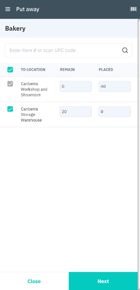 Click an item to choose a location or bin to put the item away and enter the quantity put away.