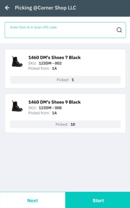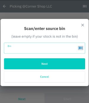 On the Picking screen, enter the item number or scan the barcode for the product to be moved, then tap Enter on your keypad. Use Next to change the bin you are picking from.