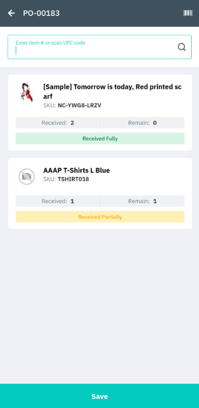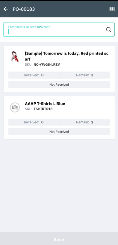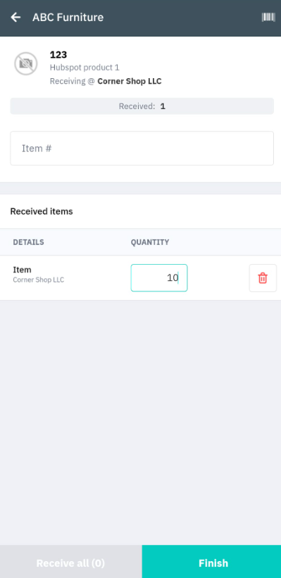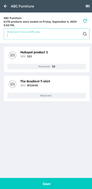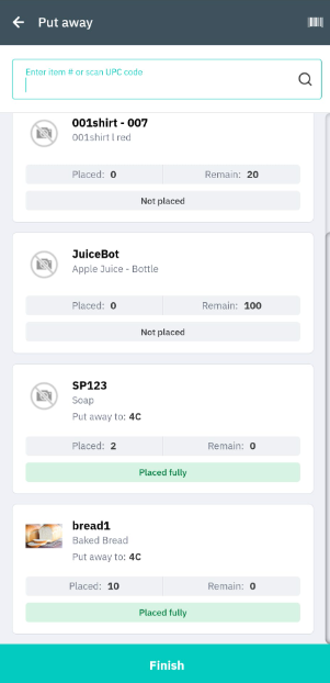 Tap the product you wish to receive, scan the item, or enter the Item #. If not using put away, enter the bin number to place the item.