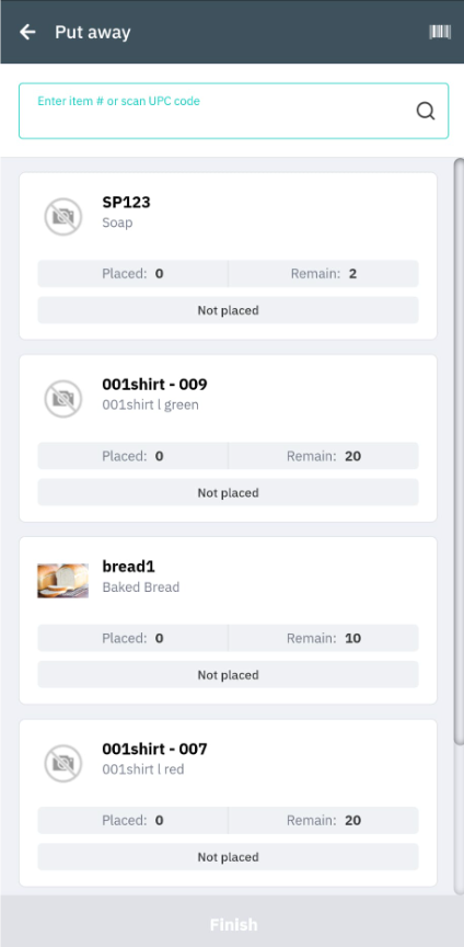 If you want to instantly place all remaining items in a new location, tap Place all. Otherwise, continue scanning items, entering the item number, or edit the quantity of items to be put away by clicking Qty, if permitted by your WMS settings.