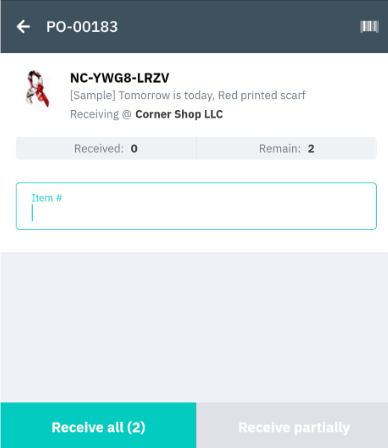 Tap Receive all to receive all units of this item. If you are still waiting for items to fully receive the purchase order quantity, or you want to place the item elsewhere, tap Receive partially to go back to the previous screen.