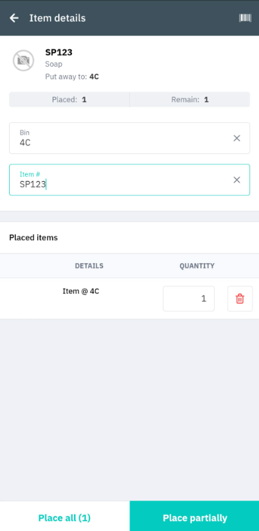If for some reason you can't or don't want to put away the entire quantity of items picked straight away, you can continue by tapping Place partially. This will return you to the Put away screen.
