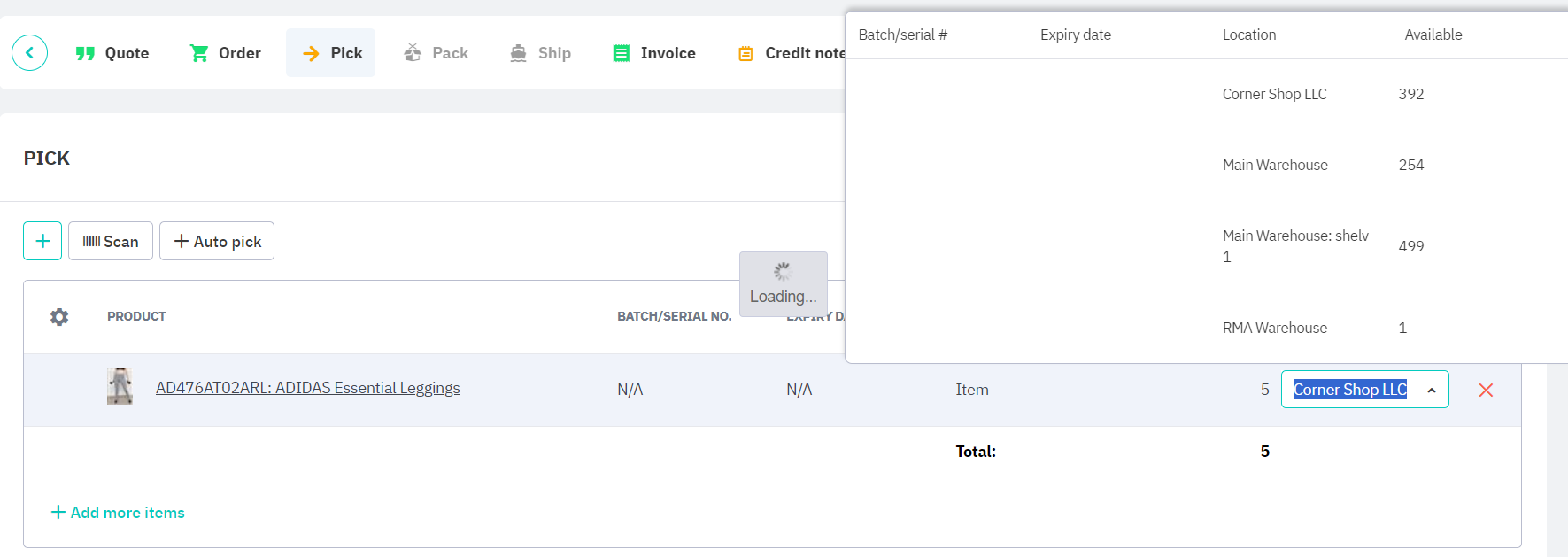 Cin7 Core web portal and WMS application allows pickers to scan and select any batch/serial number while picking stock for sale order fulfillment. See Recommend and enforce picking in FIFO/FEFO order for more information about stock picking settings.