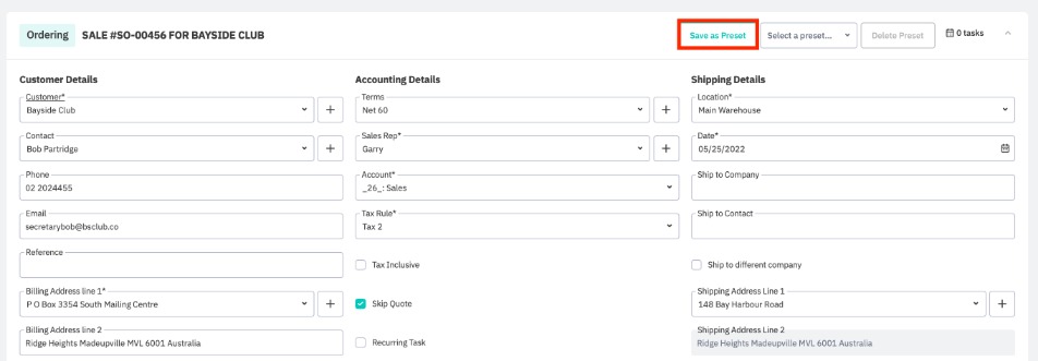 Save sales order details for future sales including customer information, accounting information, shipping and billing information, order lines, and product quantities. Sales order details are saved as a template which you can then use for future orders.