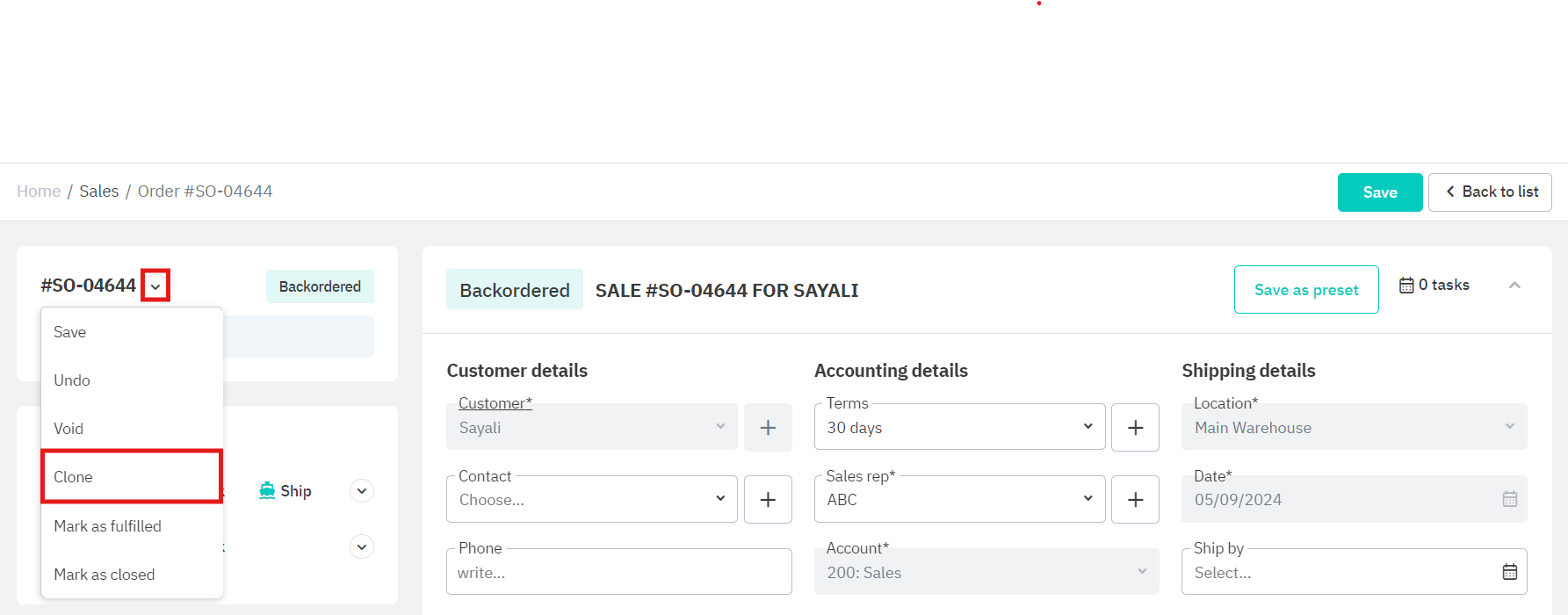Clone a sales order