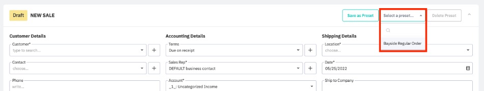Use a template by creating a new sale or selecting a draft sale order. Click Select a preset… and select a saved template from the dropdown menu. This will pre-fill the sale order fields with the saved information.