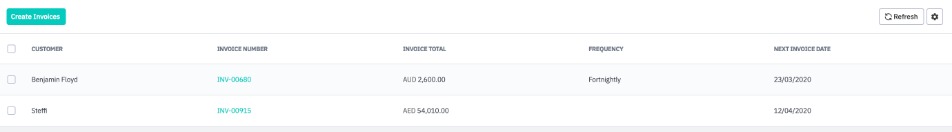 To view the sales orders that are currently set to repeat, navigate to Sales → Recurring sales. Recurring invoices will be automatically generated on the date set; however, to generate one earlier, select it from the list on this screen and click Create Invoices.