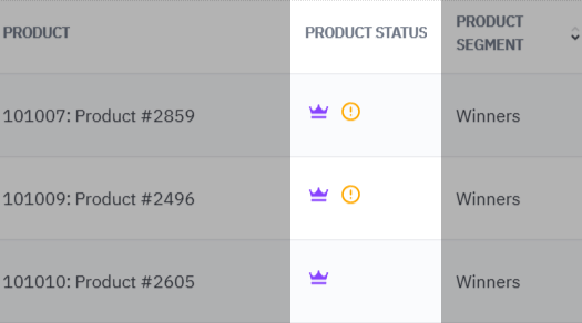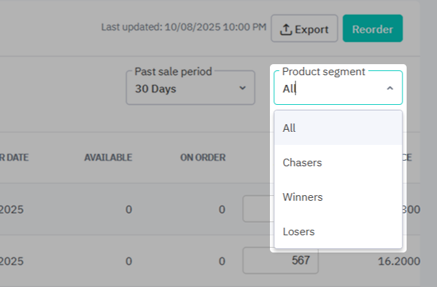 Track your Winners, Chasers, and Losers in Smart Reorder in the Product segment column. This lets you prioritize your Winner products first.