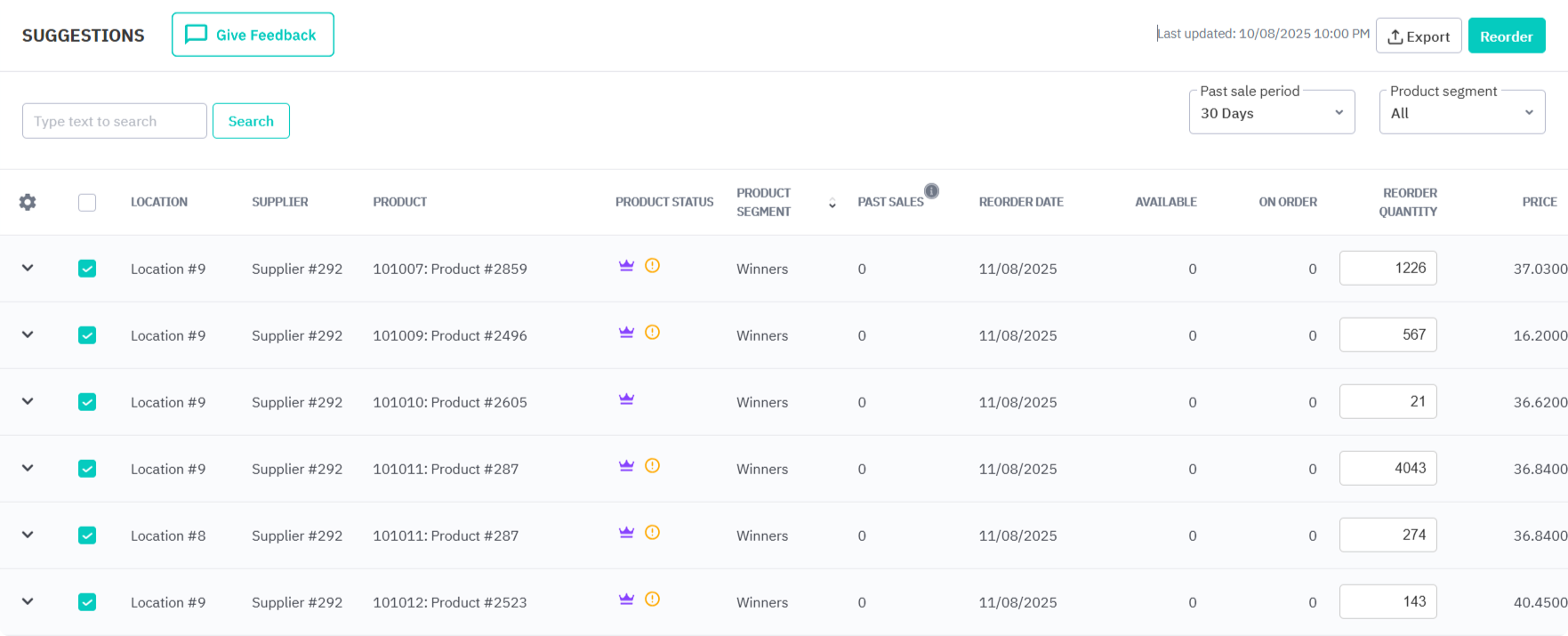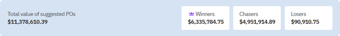 Smart reorder provides a total for its suggestions and sub-totals for your Winner, Chasers, and Losers. This helps you plan your budget and target your replenishment accordingly.