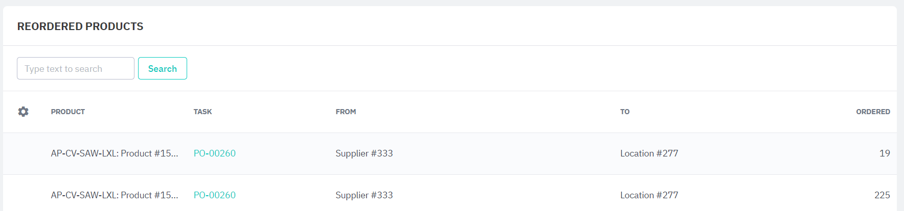 - Click Reorder to create authorized transfers. You can view these in the Reordered products summary.