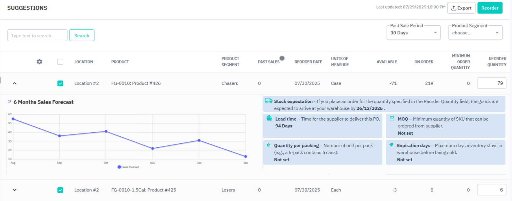 ForesightAI provides recommendations that are optimized for your inventory management. While we do not recommend changing these proposed quantities, you can manually adjust the Reorder quantity. Before adjusting the quantity, you should review the Product insights, Totals, Product status, and the Product segments to make an informed decision.