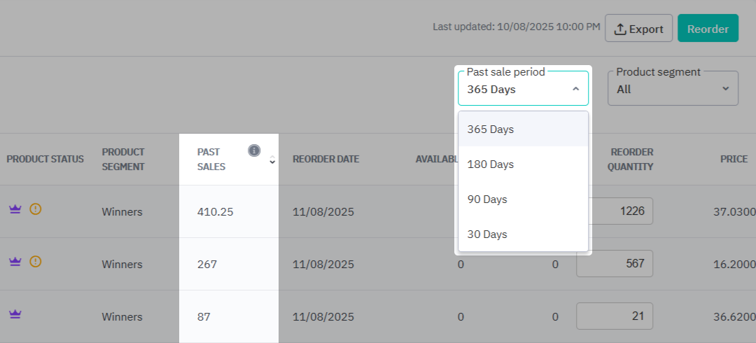 You can review your historical sales for each SKU when deciding on the appropriate replenishment with Smart Reorder. The Past sales column shows the amount sold (for each SKU) during your chosen period. You can change this time period in the Past sale period to show the sales quantity in the last 30, 90, 180, or 365 days.