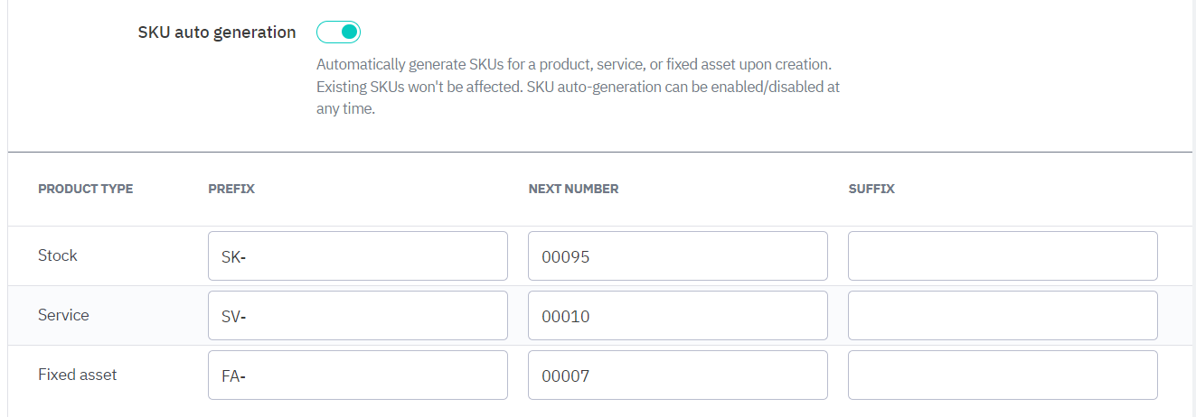 Choose whether to generate SKUs for your stock, service, and fixed asset inventory items automatically or manually enter SKUs yourself. Enabling SKU auto-generation will let you specify the SKU naming pattern for each type. SKU auto-generation can be enabled/disabled at any time without affecting existing SKUs.