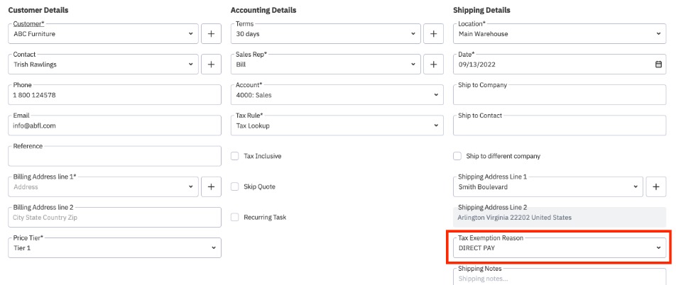 When processing a sale for this customer, if a tax-exempt address is selected as the Shipping Address, the tax exemption reason code will automatically be brought through to the document header. It can be changed or removed at this stage, if necessary.