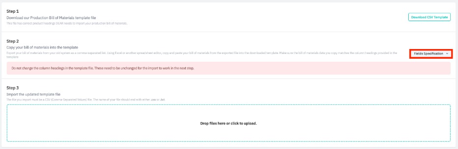 Download the production BOM CSV template and fill it in with your information. You can expand the Field specifications to get more information about each column heading. Do not change the column headings, or it will cause errors during the import.